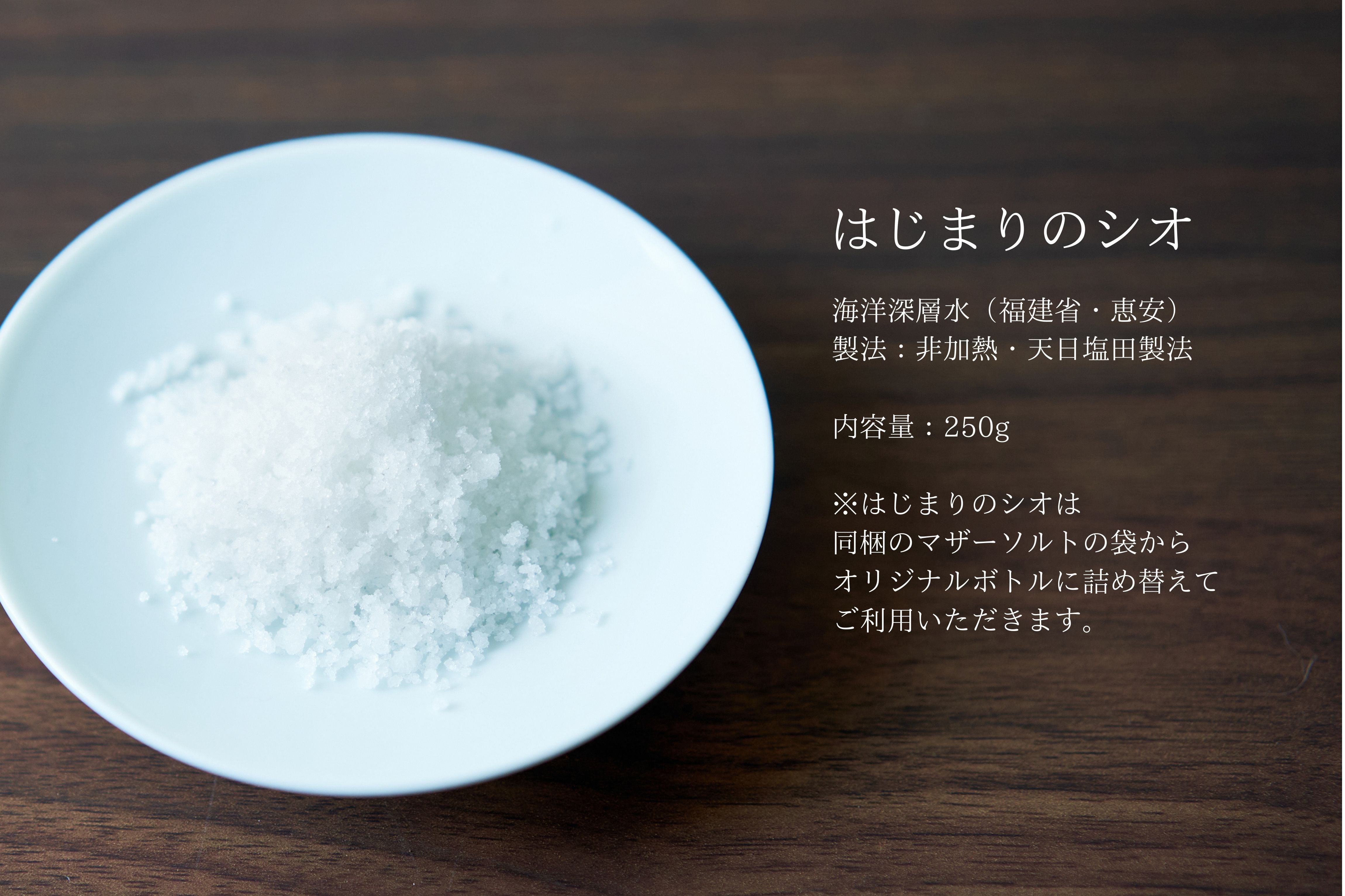 ※はじまりのシオは同梱のマザーソルトの袋からオリジナルボトルに詰め替えてご利用いただきます。天日塩は粒子が粗いのも特徴です。サラダや、お料理の仕上げ等にご使用の場合は、ミルへの詰め替えをお勧めいたします。